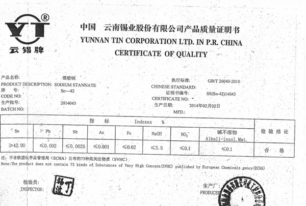 簡介:主要用于電鍍行業(yè)堿性鍍錫和鍍銅,以及錫合金、鋅錫合金、鋁合金等合金的電鍍和化學(xué)鍍。在紡織行業(yè)用作防火劑,增重劑。印染行業(yè)用作媒染劑。也用于玻璃、陶瓷等工業(yè)。